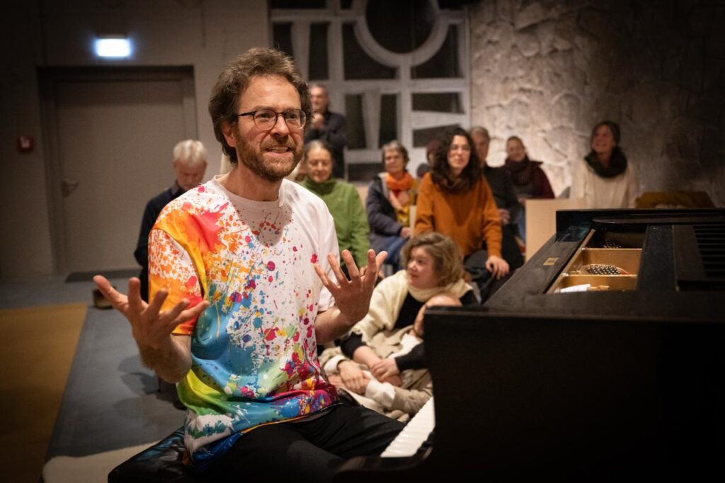 Matthias Ritter entwickelt am Flügel Musik im Moment – aus Ideen des Publikums: Wörter, Töne, Stille.